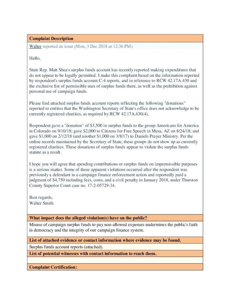Complaint Description Walter reported an issue (Mon, 3 Dec 2018 at 12:36 PM) Hello, State Rep. Matt Shea\'s surplus funds account has recently reported making expenditures that do not appear to be