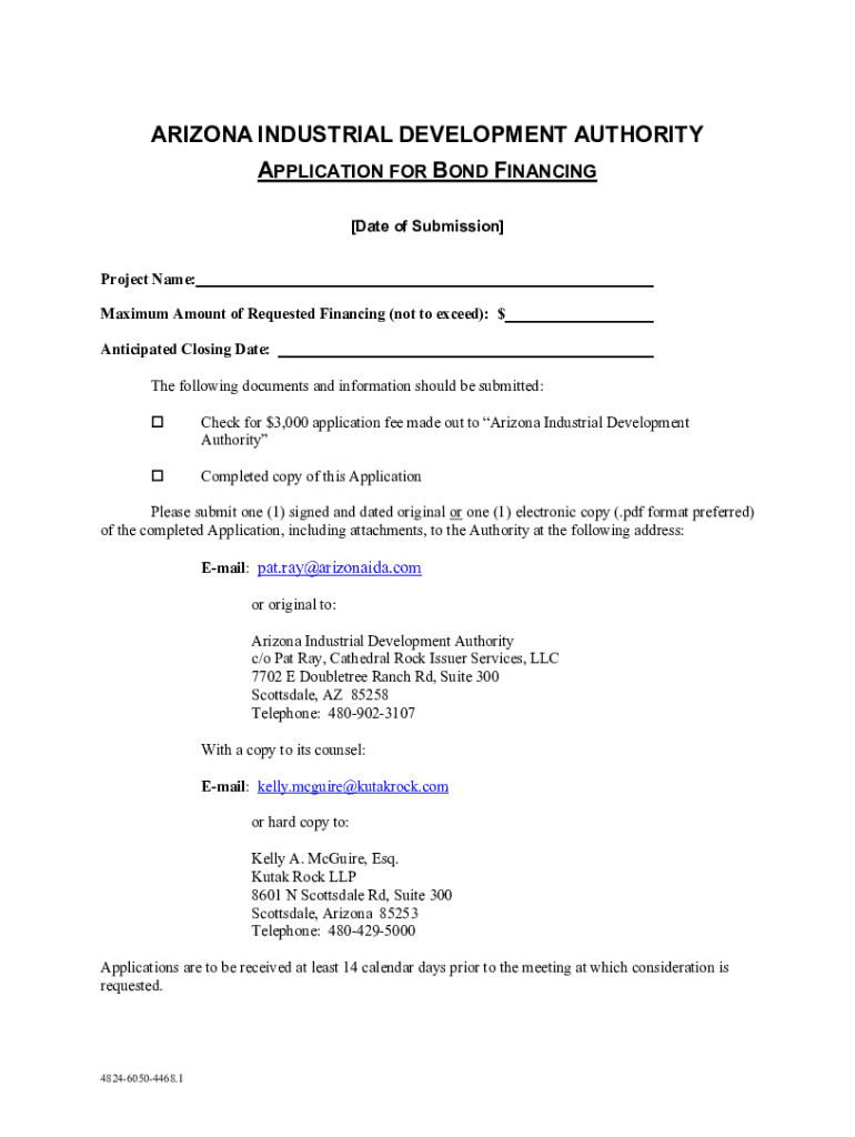 ARIZONA INDUSTRIAL DEVELOPMENT AUTHORITY APPLICATION FOR BOND FINANCING [Date of Submission] Project Name: Maximum Amount of Requested Financing (not to exceed): $ Anticipated Closing Date: The following