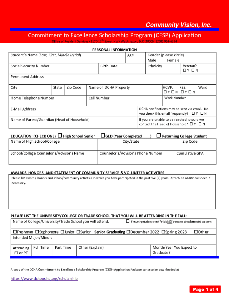 Community Vision, Inc. Commitment to Excellence Scholarship Program (ESP) Application office of Resident Services 1170 12 Street NW Washington, D.C. 20005 (202) 9146334PERSONAL INFORMATION Students