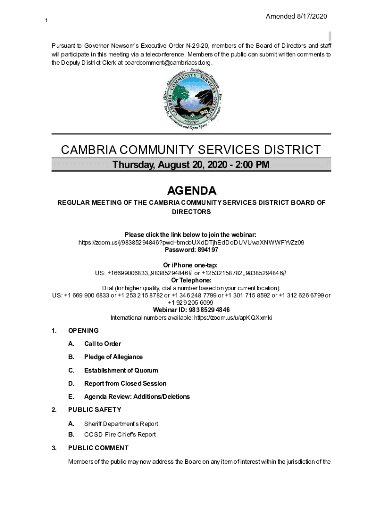 Amended 8/17/20201Pursuant to Governor Newsom\'s Executive Order N2920, members of the Board of Directors and staff will participate in this meeting via a teleconference. Members of the public can