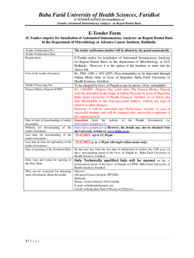 Baba Farid University of Health Sciences, Haricot TENDER NOTICE for Installation of Tender Automated Immunoassay Analyzer on Regent Rental BasisETender Form (Tender inquiry for installation of Automated