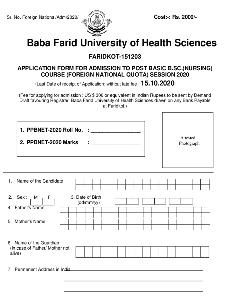 Cost:: Rs. 2000/Sr. No. Foreign National/Adm/2020/Baba Farid University of Health Sciences FARIDKOT151203 APPLICATION FORM FOR ADMISSION TO POST BASIC B.SC.(NURSING) COURSE (FOREIGN NATIONAL QUOTA)
