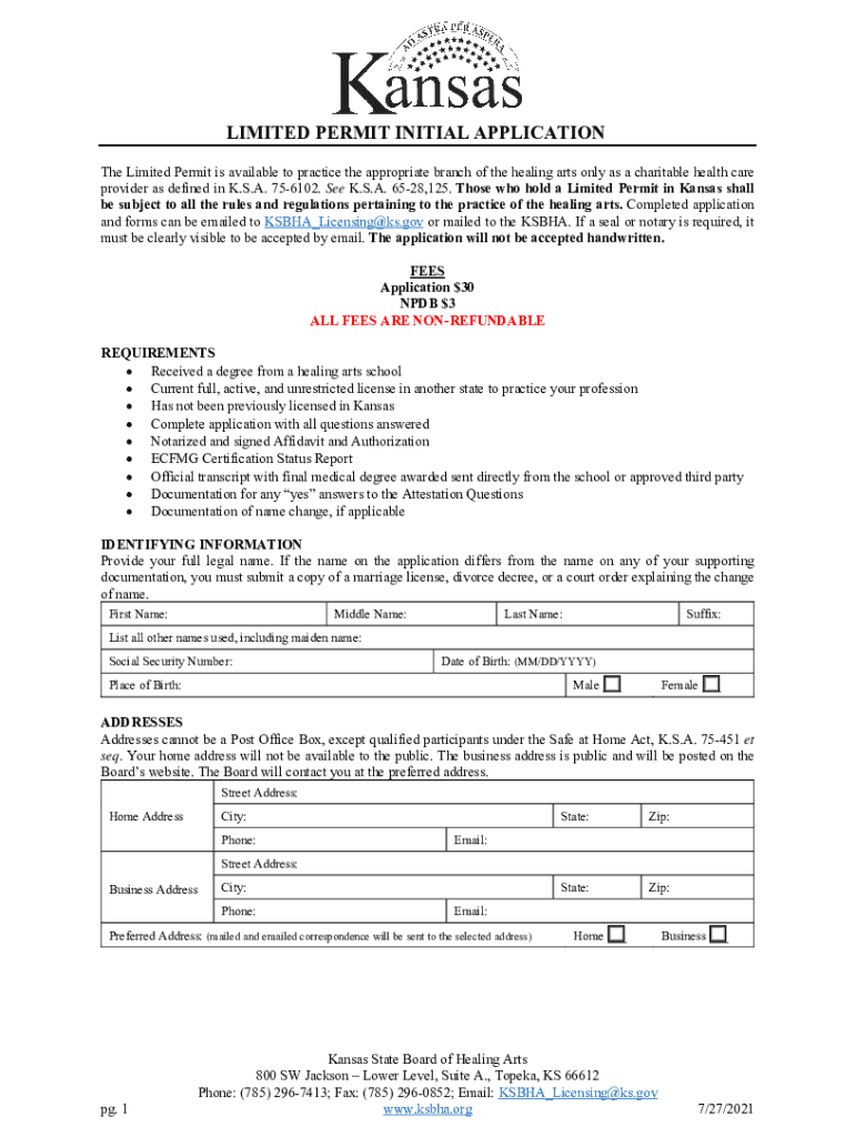 LIMITED PERMIT INITIAL APPLICATION The Limited Permit is available to practice the appropriate branch of the healing arts only as a charitable health care provider as defined in K.S.A. 756102. See