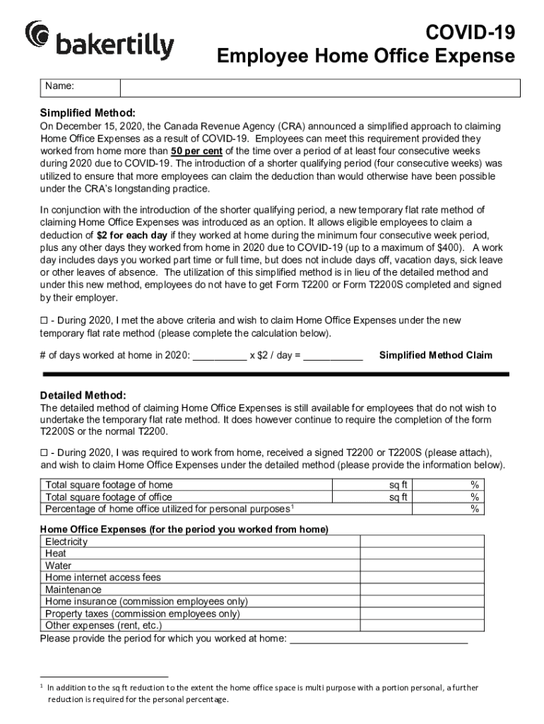 COVID-19 Employee Home Office Expense Name:Simplified Method:On December 15, 2020, the Canada Revenue Agency (CRA) announced a simplified approach to claiming Home Office Expenses as a result of COVID-19.