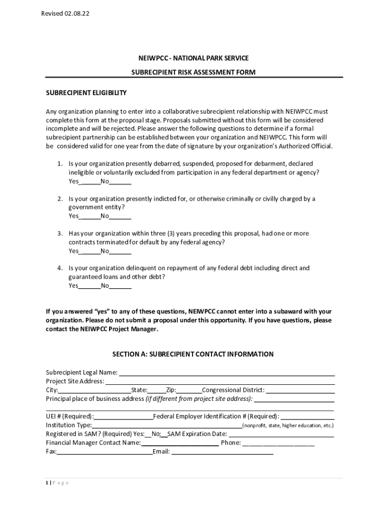 Revised 02.08.22NEIWPCC NATIONAL PARK SERVICE RECIPIENT RISK ASSESSMENT FORM RECIPIENT ELIGIBILITY Any organization planning to enter into a collaborative subrecipient relationship with IPCC must