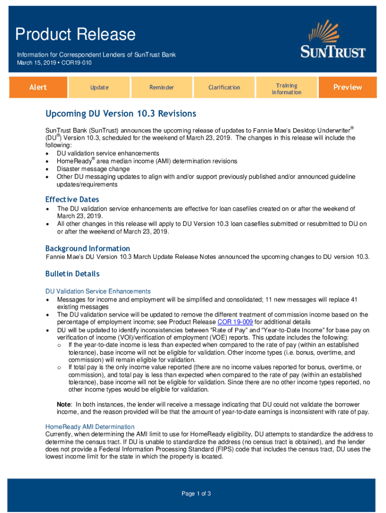 Product Release Information for Correspondent Lenders of Entrust Bank March 15, 2019 COR19010AlertUpdateReminderClarificationTraining InformationPreviewUpcoming DU Version 10.3 Revisions Entrust Bank