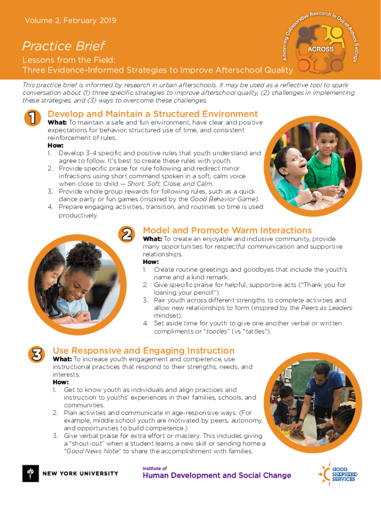 Volume 2, February 2019Practice Brief Lessons from the Field: Three EvidenceInformed Strategies to Improve After school Quality This practice brief is informed by research in urban after schools.