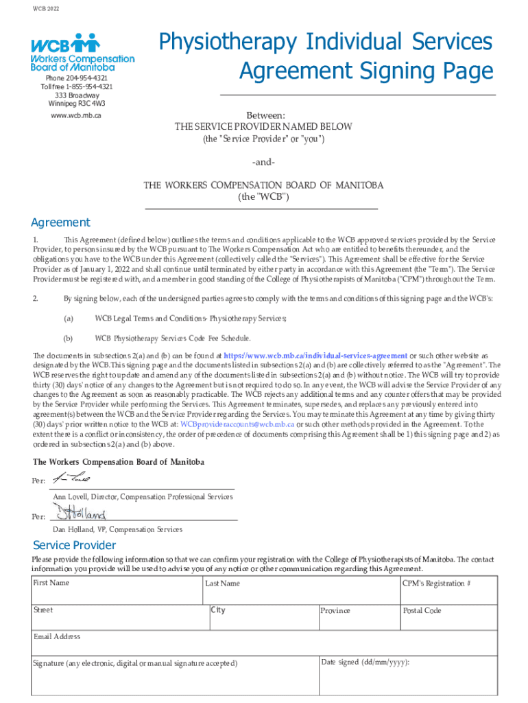 WEB 2022Phone 2049544321 Toll free 18559544321 333 Broadway Winnipeg R3C 4W3 www.wcb.mb.caPhysiotherapy Individual Services Agreement Signing Page Between: THE SERVICE PROVIDER NAMED BELOW (the \”