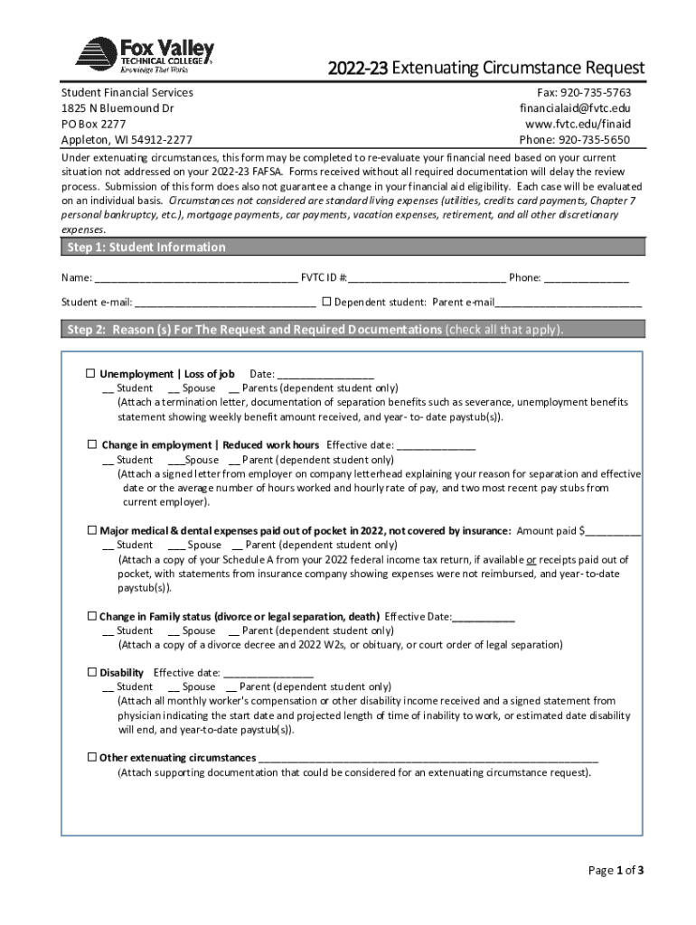 202223 Extenuating Circumstance Request Student Financial Services 1825 N Blue mound Dr PO Box 2277 Appleton, WI 549122277Fax: 9207355763 financialaid@fvtc.edu www.fvtc.edu/finaid Phone: 9207355650Under