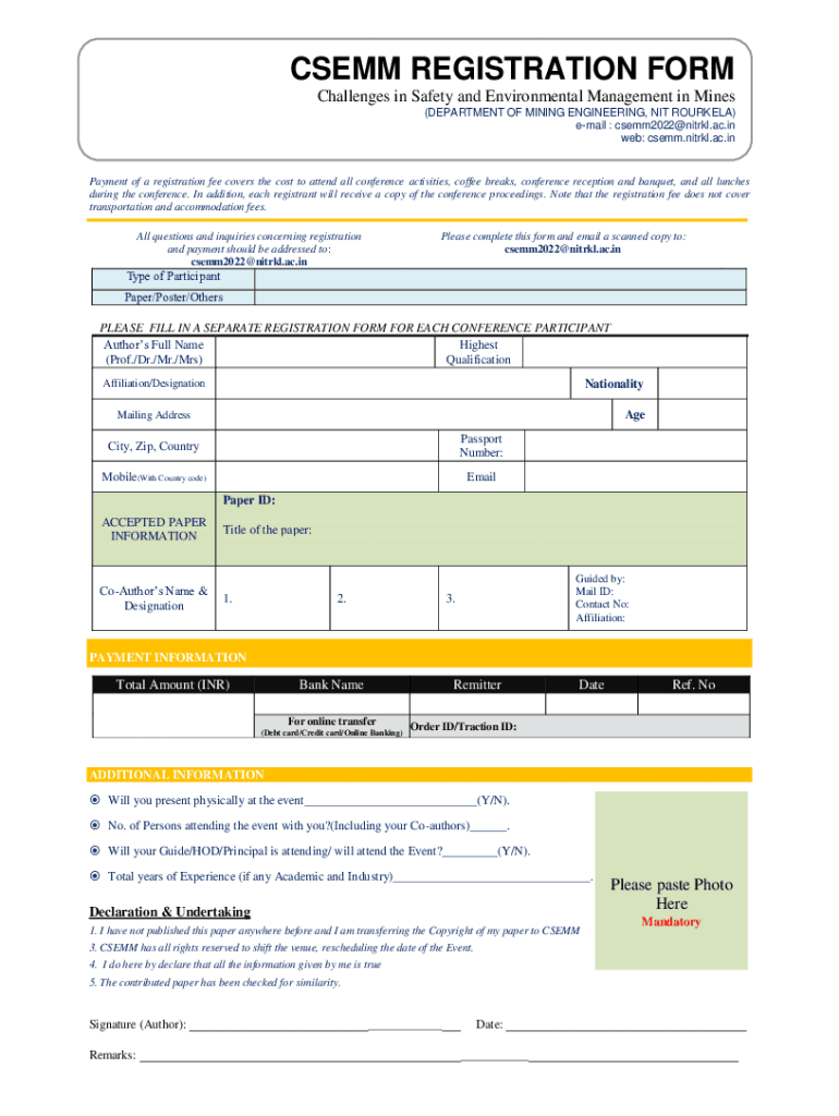 CS EMM REGISTRATION FORM Challenges in Safety and Environmental Management in Mines (DEPARTMENT OF MINING ENGINEERING, NIT ROURKELA) email : csemm2022@nitrkl.ac.in web: semi.nitric.ac.payment of a