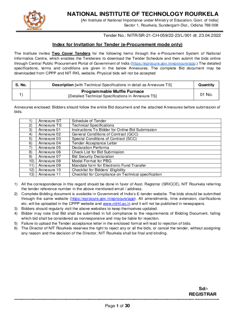 NATIONAL INSTITUTE OF TECHNOLOGY ROURKELA [An Institute of National Importance under Ministry of Education, Govt. of India] Sector 1, Rourkela, Underarm Dist., Odisha 769 008Tender No.: NIR/SR21CH059/2223/L/001