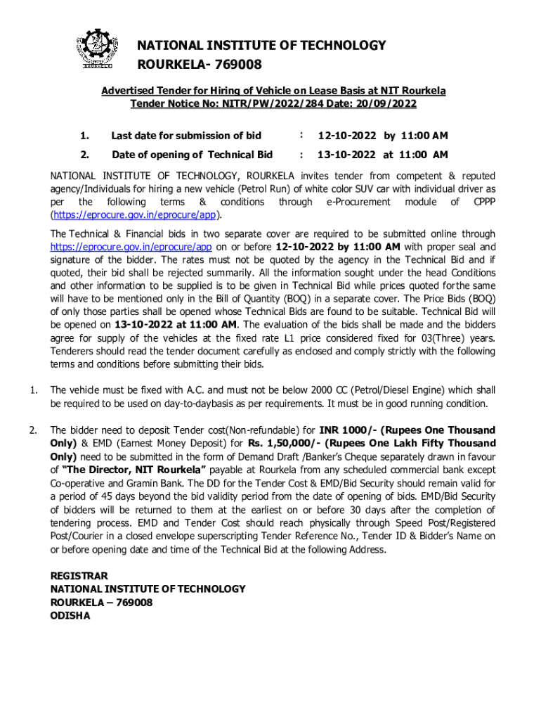 NATIONAL INSTITUTE OF TECHNOLOGY ROURKELA 769008 Advertised Tender for Hiring of Vehicle on Lease Basis at NIT Rourkela Tender Notice No: NIR/PW/2022/284 Date: 20/09/2022 1. Last date for submission