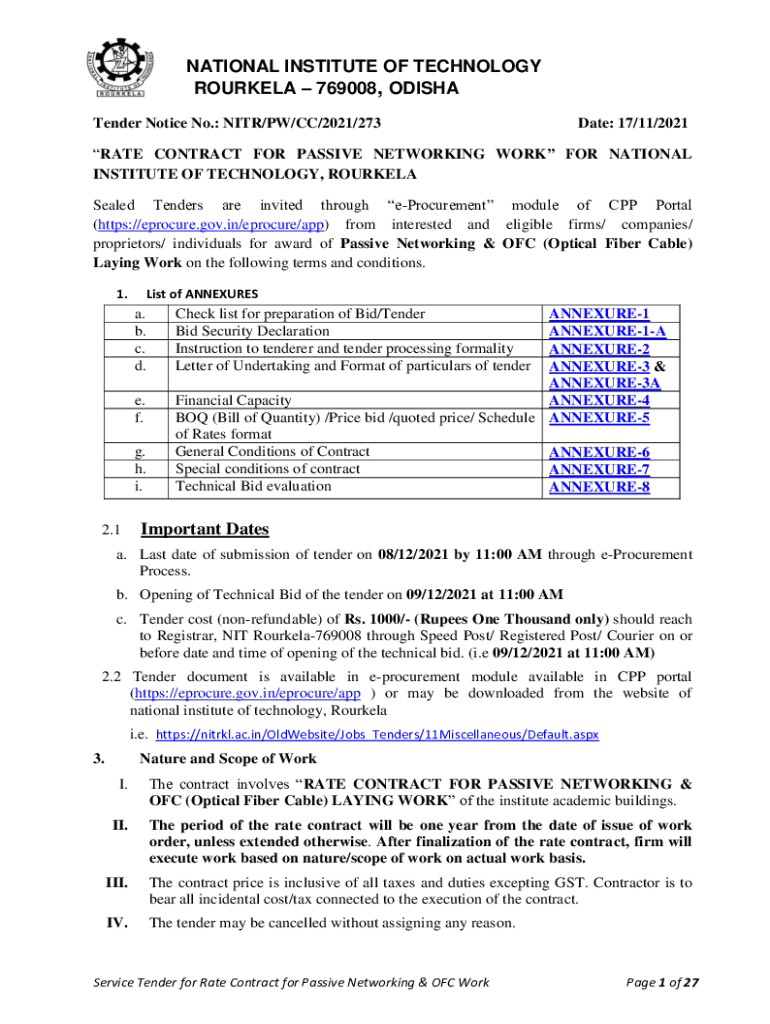 NATIONAL INSTITUTE OF TECHNOLOGY ROURKELA 769008, ODISHA Tender Notice No.: NIR/PW/CC/2021/273Date: 17/11/2021RATE CONTRACT FOR PASSIVE NETWORKING WORK FOR NATIONAL INSTITUTE OF TECHNOLOGY, ROURKELA