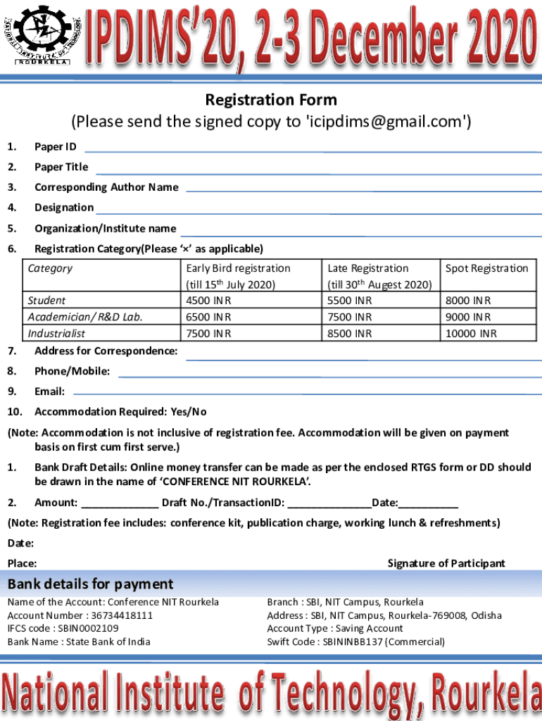 Registration Form (Please send the signed copy to \'icipdims@gmail.com\') 1. Paper ID2. Paper Title3. Corresponding Author Name4. Designation5. Organization/Institute name6. Registration Category(Please