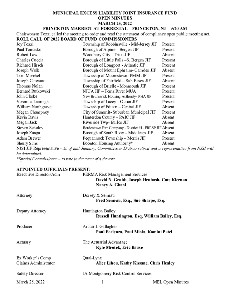 MUNICIPAL EXCESS LIABILITY JOINT INSURANCE FUND OPEN MINUTES MARCH 25, 2022, PRINCETON MARRIOTT AT FORREST PRINCETON, NJ 9:20 AM Chairwoman Toni called the meeting to order and read the statement