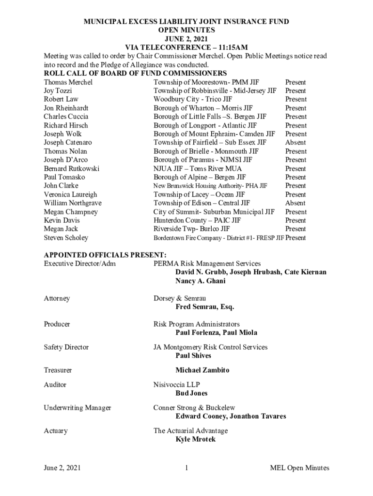 MUNICIPAL EXCESS LIABILITY JOINT INSURANCE FUND OPEN MINUTES JUNE 2, 2021, VIA TELECONFERENCE 11:15AM Meeting was called to order by Chair Commissioner Marched. Open Public Meetings notice read into