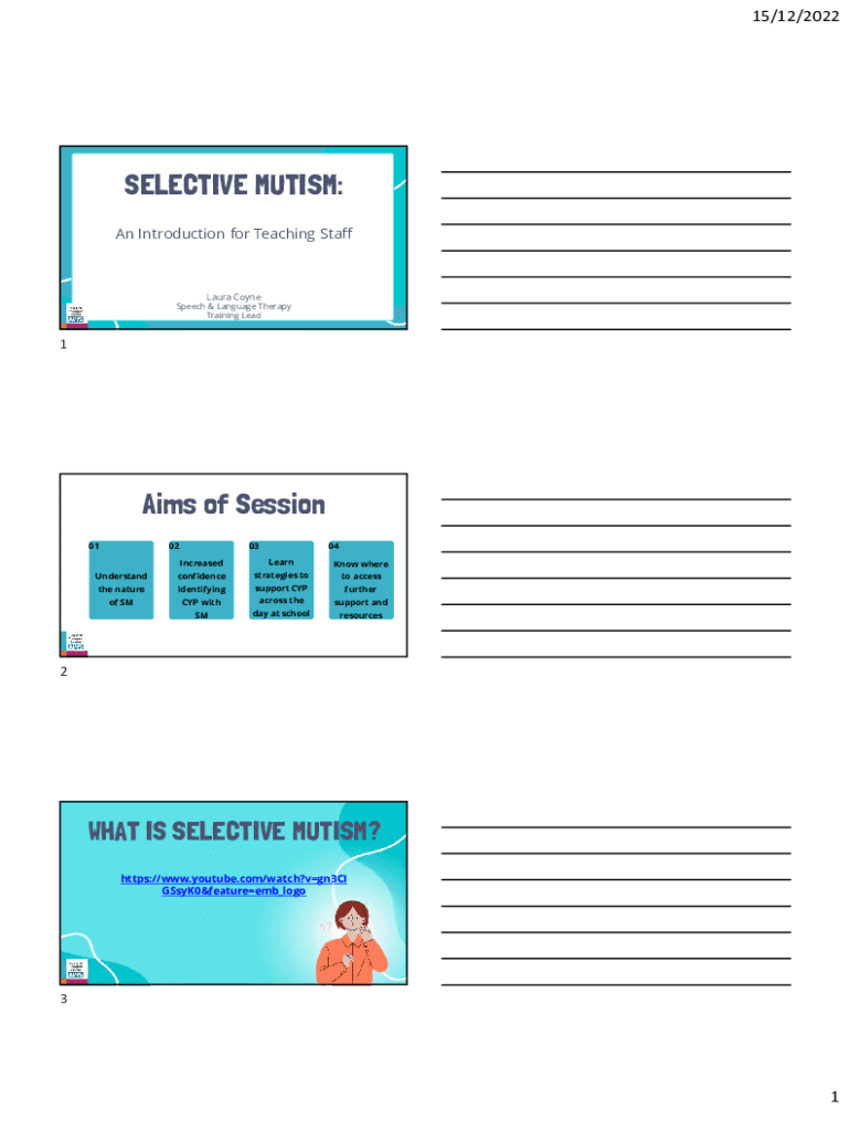 15/12/2022SELECTIVE MUTISM: An Introduction for Teaching Staff Laura CoyneSpeech & Language Therapy Training Lead1Aims of Session 02010304IncreasedLearnUnderstandconfidencestrategies tithe natureidentifyingsupport