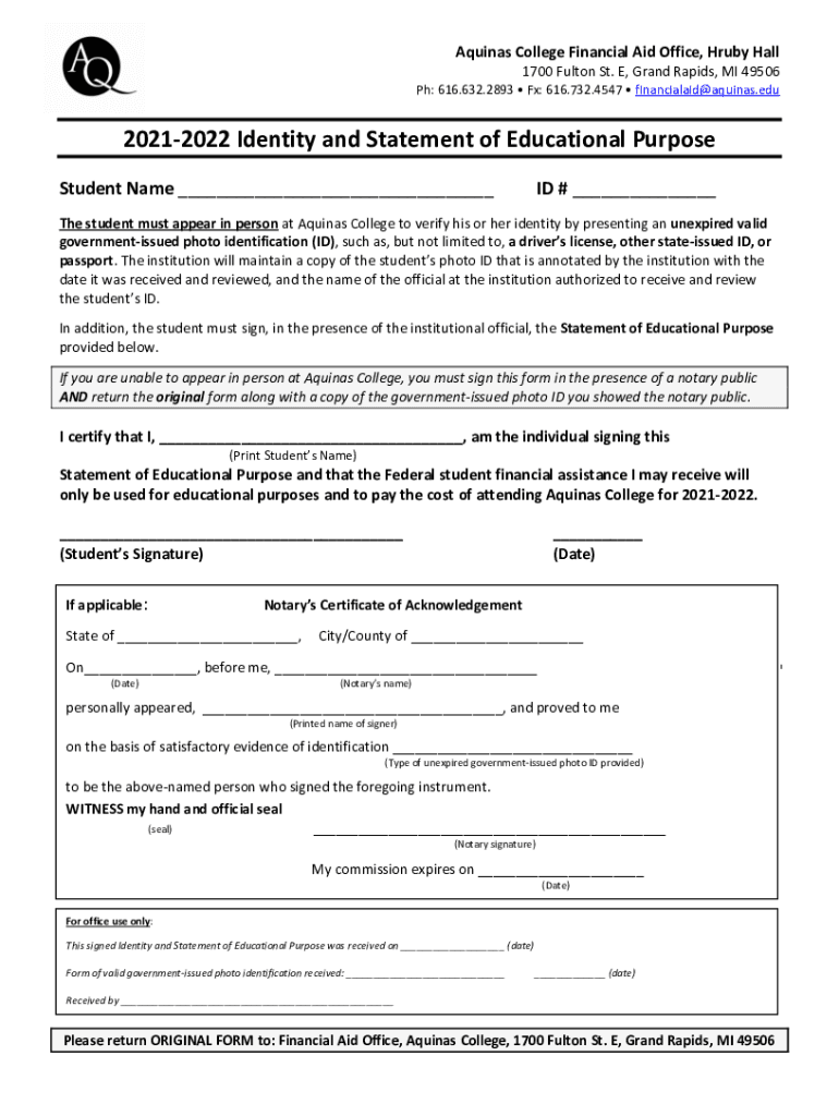 Aquinas College Financial Aid Office, Ruby Hall 1700 Fulton St. E, Grand Rapids, MI 49506 pH: 616.632.2893 FX: 616.732.4547 financialaid@aquinas.edu20212022 Identity and Statement of Educational Purpose
