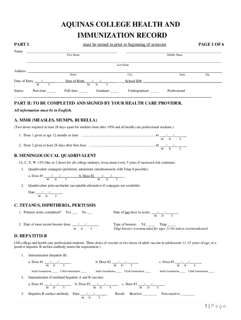 AQUINAS COLLEGE HEALTH AND IMMUNIZATION RECORD PART I Name must be turned in prior to beginning of semester___PAGE 1 OF 6___First NameMiddle Name___ Last Headdress ___ Streetcar of Entry ___/___ Mitigate