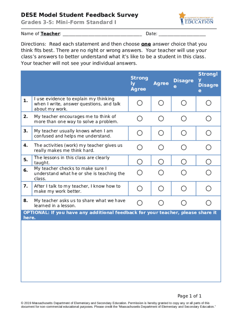 The Grades 3-5: DESE Model Survey Mini Standard I and II is a document that can be filled-out and signed for certain reasons. Next, it is furnished to the exact addressee to provide specific info and data. The completion and signing can be done in hard copy by hand or using a suitable application e. g. PDFfiller. Such tools help to send in any PDF or Word file without printing them out. It also allows you to customize its appearance for your needs and put an official legal digital signature. Once finished, the user ought to send the Grades 3-5: DESE Model Survey Mini Standard I and II to the recipient or several of them by mail and also fax. PDFfiller provides a feature and options that make your Word form printable. It has various settings when printing out appearance. It doesn't matter how you file a document - physically or by email - it will always look neat and clear. To not to create a new document from the beginning over and over, make the original form into a template. After that, you will have an editable sample.