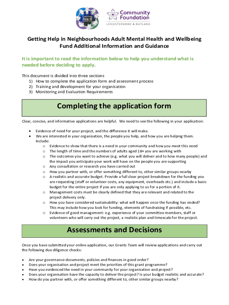 Getting Help in Neighborhoods Adult Mental Health and Wellbeing Fund Additional Information and Guidance It is important to read the information below to help you understand what is needed before