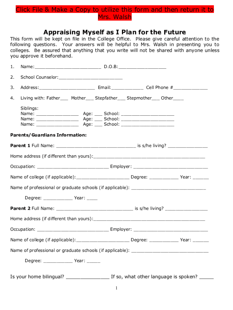 Click File & Make a Copy to utilize this form and then return it to Mrs. Walsh Appraising Myself as I Plan for the Futures form will be kept on file in the College Office. Please give careful attention