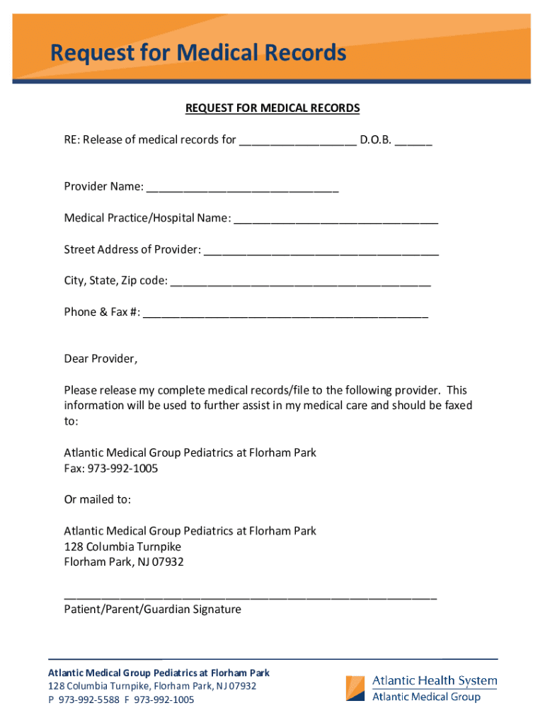Request for Medical Records REQUEST FOR MEDICAL RECORDS RE: Release of medical records for ___ D.O.B. ___Provider Name: ___ Medical Practice/Hospital Name: ___ Street Address of Provider: ___ City,