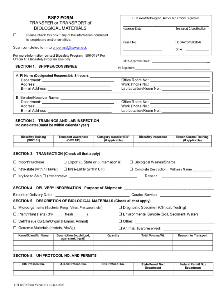 BSP2 FORM TRANSFER or TRANSPORT of BIOLOGICAL MATERIALS Please check this box if any of the information contained is proprietary and/or sensitive. Scan completed form to uhpermit@hawaii.edu For more