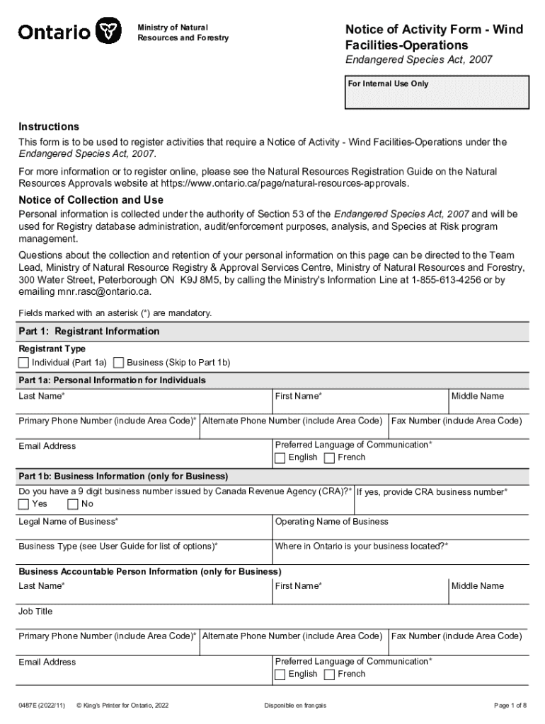 Notice of Activity Form Wind FacilitiesOperationsMinistry of Natural Resources and ForestryEndangered Species Act, 2007 For Internal Use OnlyInstructions This form is to be used to register activities