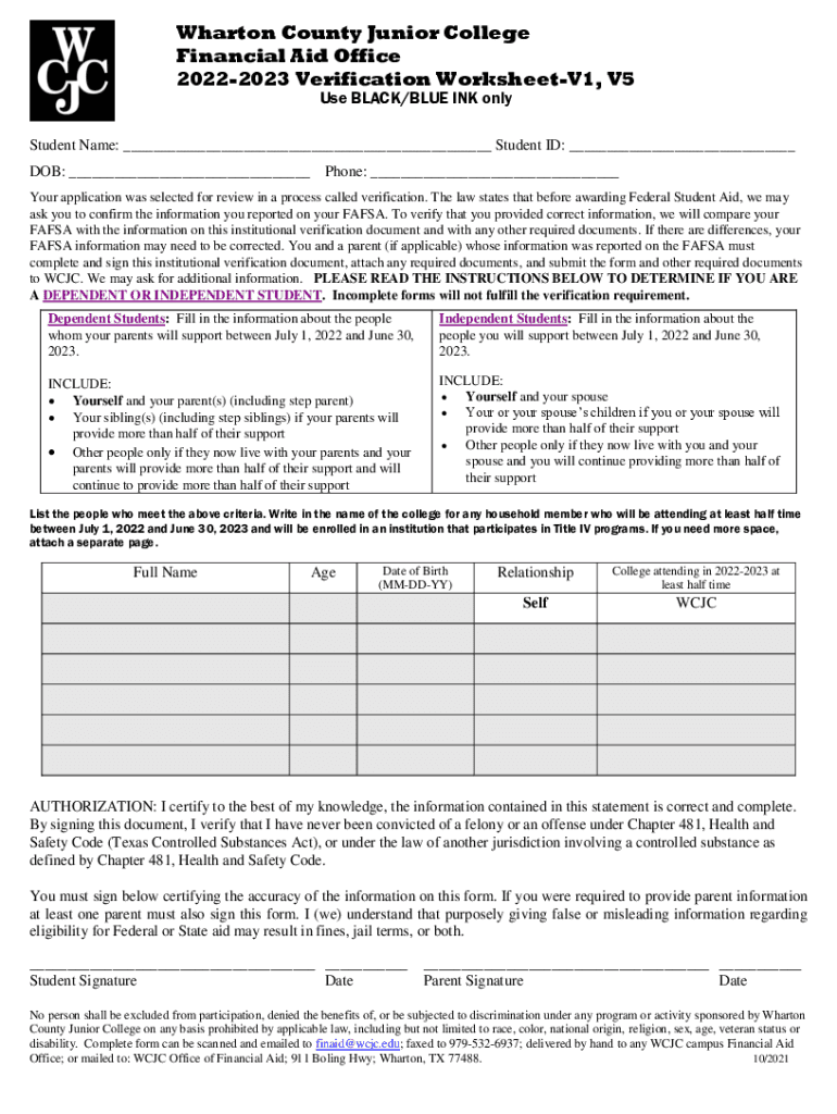 Wharton County Junior College Financial Aid Office 20222023 Verification WorksheetV1, V5 Use BLACK/BLUE INK onlyStudent Name: ___ Student ID: ___ DOB: ___ Phone: ___ Your application was selected