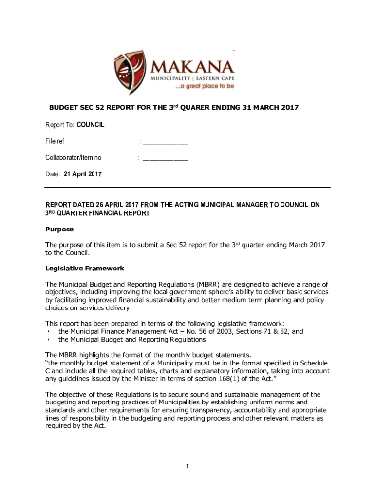 BUDGET SEC 52 REPORT FOR THE 3rd QUARTER ENDING 31 MARCH 2017Report To: COUNCIL File ref: ___Collaborator/Item no: ___Date: 21 April 2017REPORT DATED 26 APRIL 2017 FROM THE ACTING MUNICIPAL MANAGER
