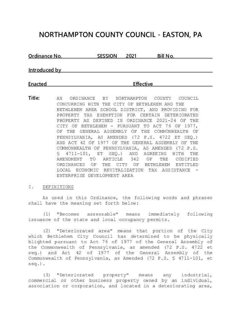 NORTHAMPTON COUNTY COUNCIL EASTON, PA Ordinance No.SESSION2021Bill No. Introduced by Enacted Title:I. Effective AN ORDINANCE BY NORTHAMPTON COUNTY COUNCIL CONCURRING WITH THE CITY OF BETHLEHEM AND
