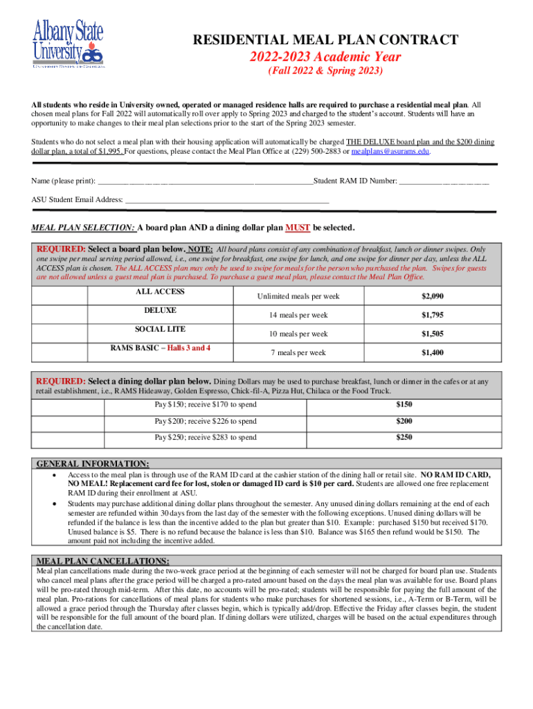 RESIDENTIAL MEAL PLAN CONTRACT 20222023 Academic Year (Fall 2022 & Spring 2023) All students who reside in University owned, operated or managed residence halls are required to purchase a residential