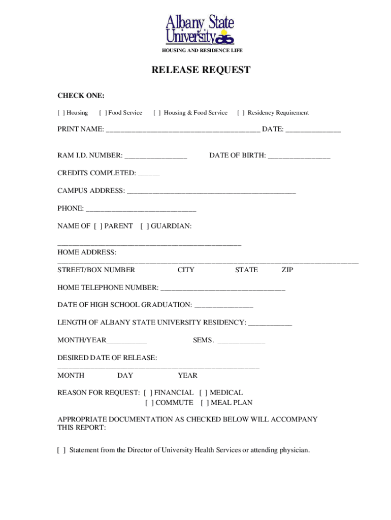 HOUSING AND RESIDENCE PRERELEASE REQUEST CHECK ONE: [ ] Housing[ ] Food Service[ ] Housing & Food Service[ ] Residency RequirementPRINT NAME: ___ DATE: ___RAM I.D. NUMBER: ___DATE OF BIRTH: ___CREDITS