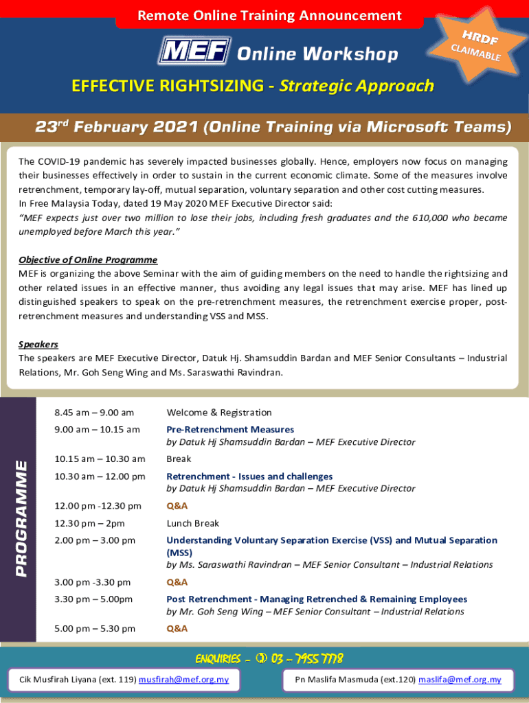 Remote Online Training AnnouncementOnline Workshop EFFECTIVE RIGHTSIZING Strategic Approach COVID-19 pandemic has severely impacted businesses globally. Hence, employers now focus on managing their