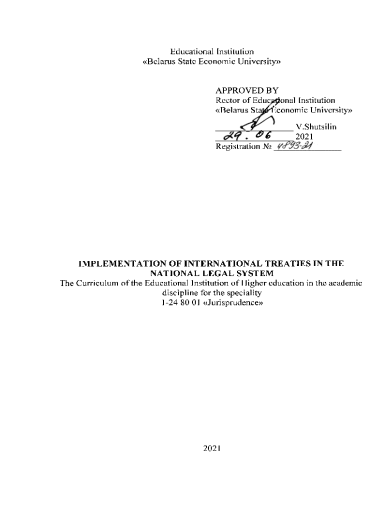 Educational Institution Belarus State Economic UniversityAPPROVED BY Rector o f Educational Institution Belarus Stal^conom IC University ___.___ V. Shuttling KG 2021 ___ Registration IMPLEMENTATION