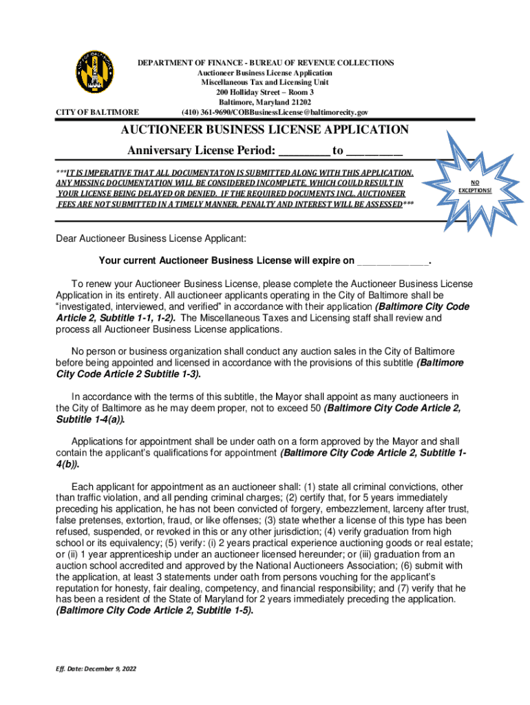 DEPARTMENT OF FINANCE BUREAU OF REVENUE COLLECTIONS Auctioneer Business License Application Miscellaneous Tax and Licensing Unit 200 Holiday Street Room 3 Baltimore, Maryland 21202 CITY OF BALTIMORE