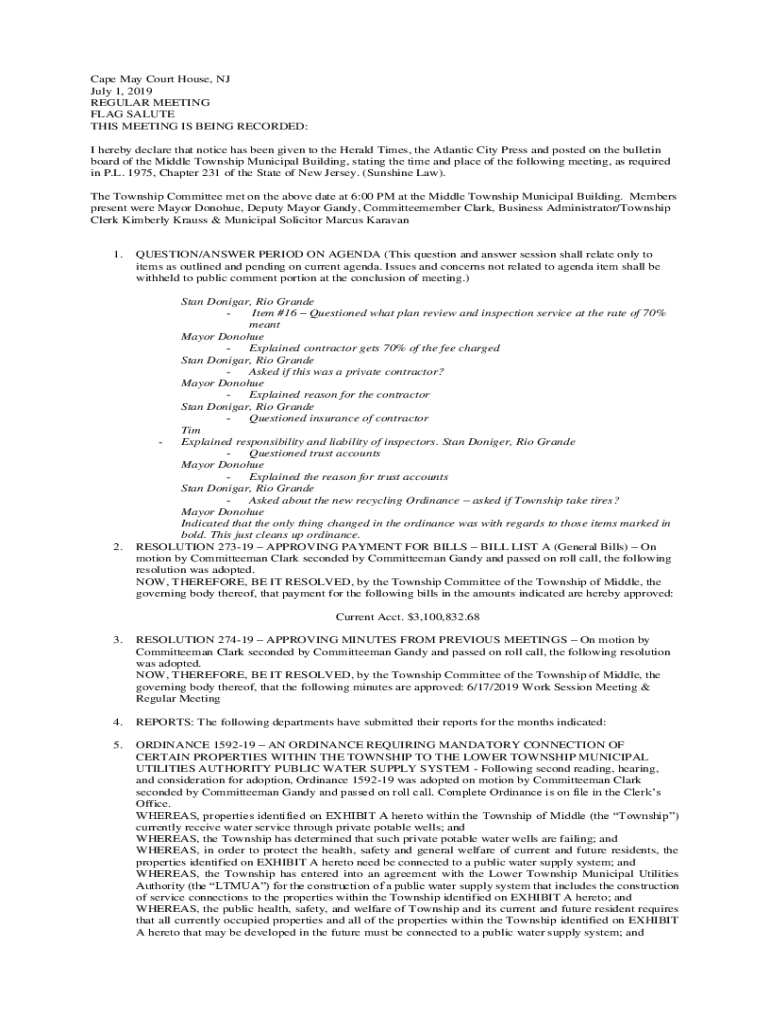 Cape May Court House, NJ July 1, 2019, REGULAR MEETING FLAG SALUTE THIS MEETING IS BEING RECORDED: I hereby declare that notice has been given to the Herald Times, the Atlantic City Press and posted