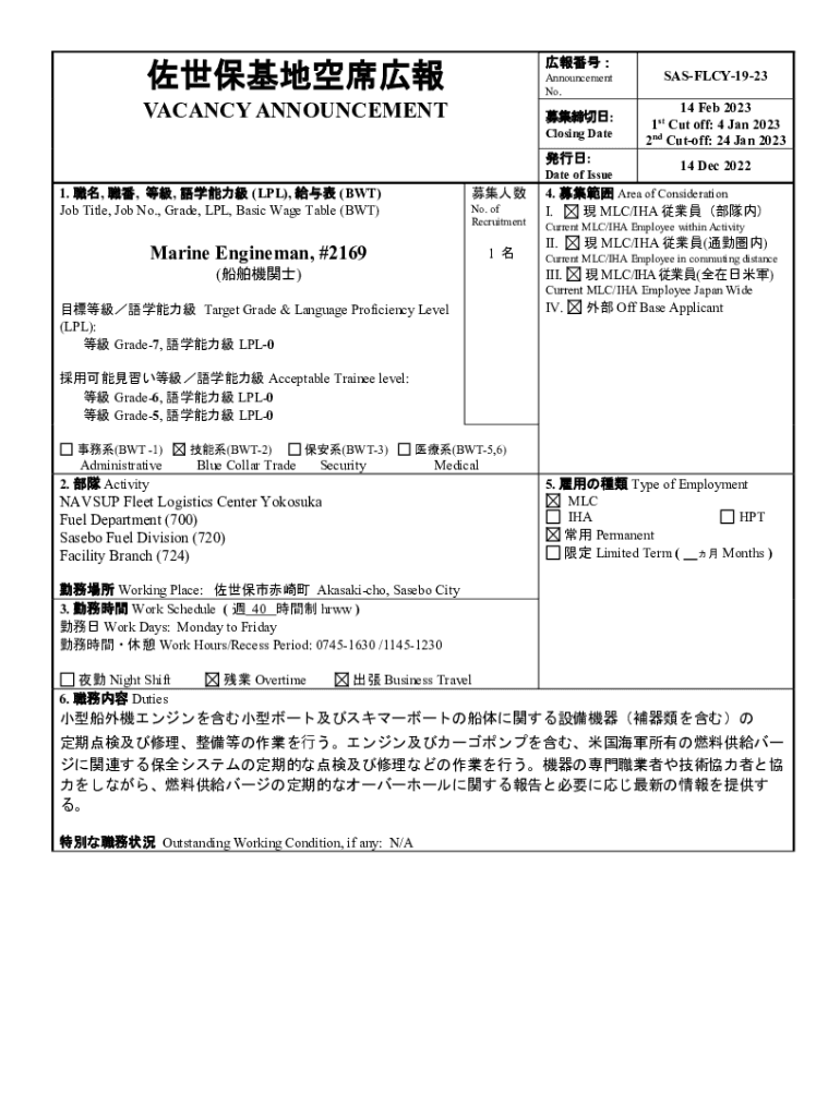 Announcement No. VACANCY ANNOUNCEMENT: Closing Date: Date of Issue1. , (LPL), (BWT) Job Title, Job No., Grade, LPL, Basic Wage Table (BWT) No. of Recruitment Marine Engine man, #21691 ()SASFLCY1923