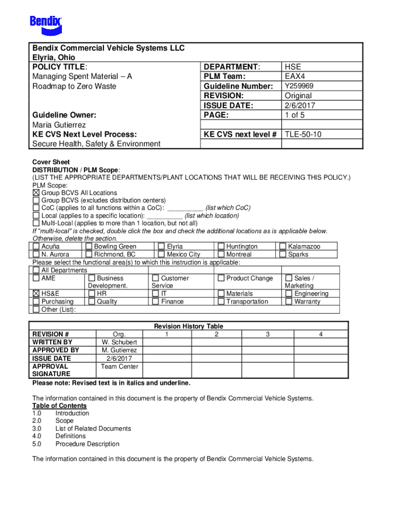 Bendix Commercial Vehicle Systems LLC Elyria, Ohio POLICY TITLE: Managing Spent Material A Roadmap to Zero WasteGuideline Owner: Maria Gutierrez KE CVS Next Level Process: Secure Health, Safety &