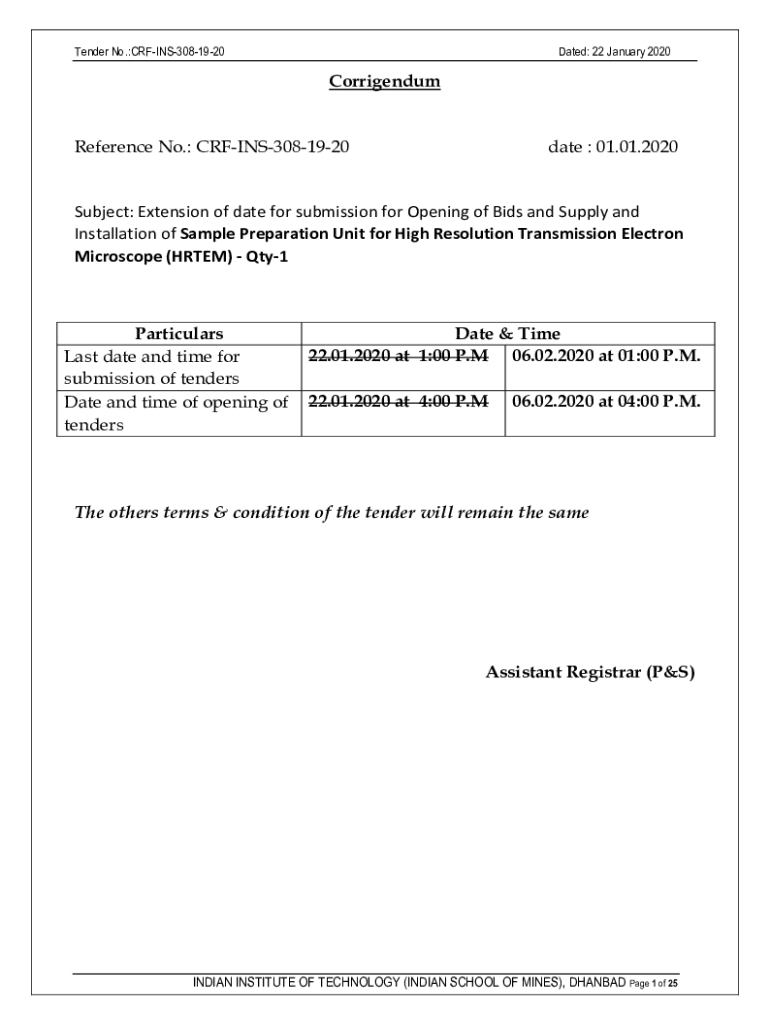 Tender No.:CRFINS3081920Dated: 22 January 2020CorrigendumReference No.: CRFINS3081920date : 01.01.2020Subject: Extension of date for submission for Opening of Bids and Supply and Installation of Sample