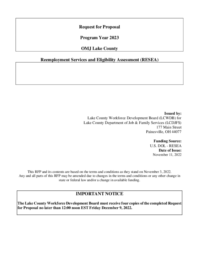 Request for Proposal Program Year 2023 OMA Lake County Reemployment Services and Eligibility Assessment (RESET)Issued by: Lake County Workforce Development Board (LCD) for Lake County Department of