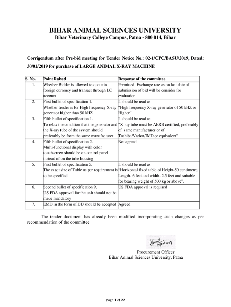 BIHAR ANIMAL SCIENCES UNIVERSITY Bihar Veterinary College Campus, Patna 800 014, BiharCorrigendum after Prebid meeting for Tender Notice No.: 021/CPC/BASE/2019, Dated: 30/01/2019 for purchase of LARGE