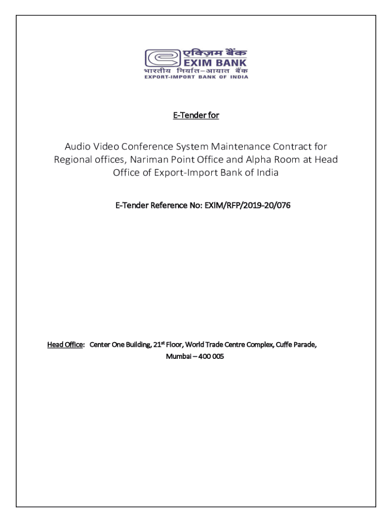Tender radio Video Conference System Maintenance Contract for Regional offices, Norman Point Office and Alpha Room at Head Office of ExportImport Bank of India Tender Reference No: EXIT/RFP/201920/076Head