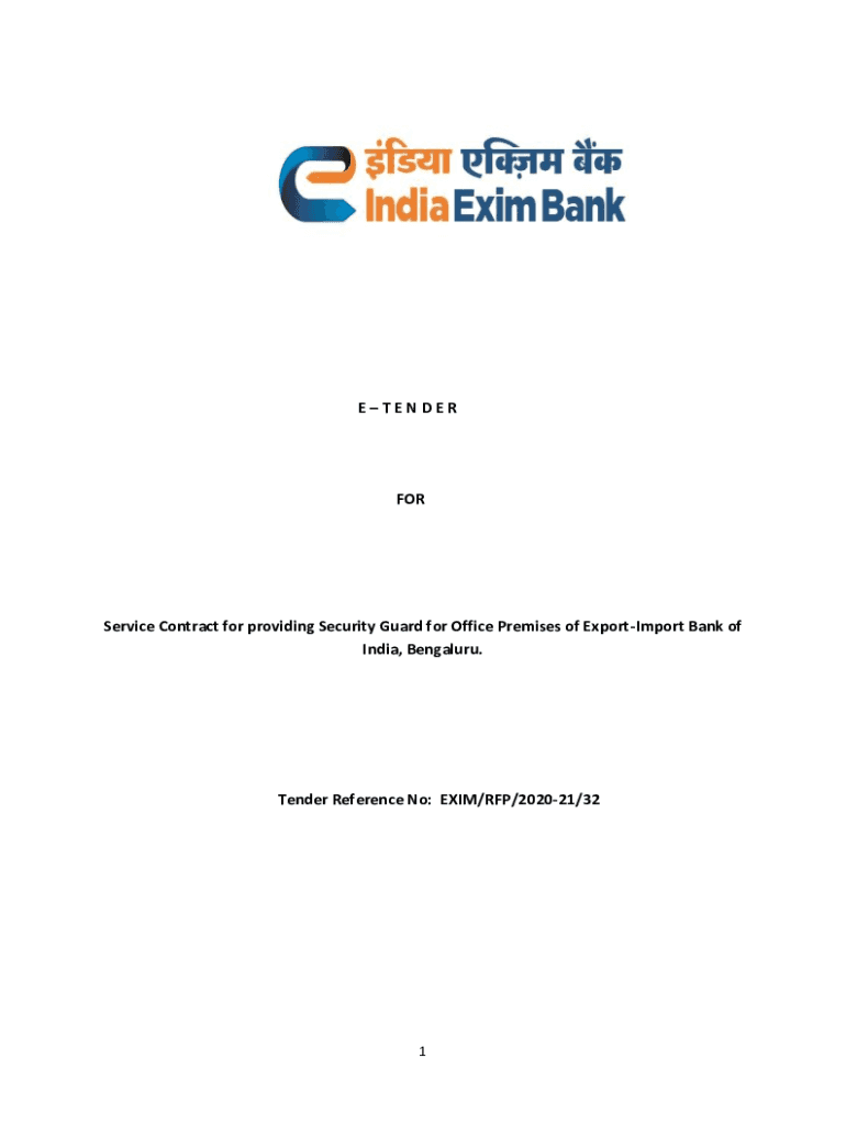 ETENDERFORService Contract for providing Security Guard for Office Premises of ExportImport Bank of India, Bengaluru. Tender Reference No: EXIT/RFP/202021/321Export Import Bank of India Ramanashree
