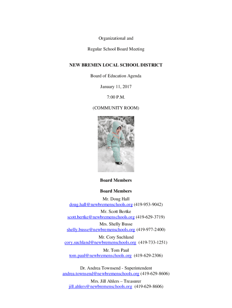 Organizational and Regular School Board Meeting BREMEN LOCAL SCHOOL DISTRICT Board of Education Agenda January 11, 2017 7:00 P.M. (COMMUNITY ROOM)Board Members Mr. Doug Hall doug.hall@newbremenschools.org