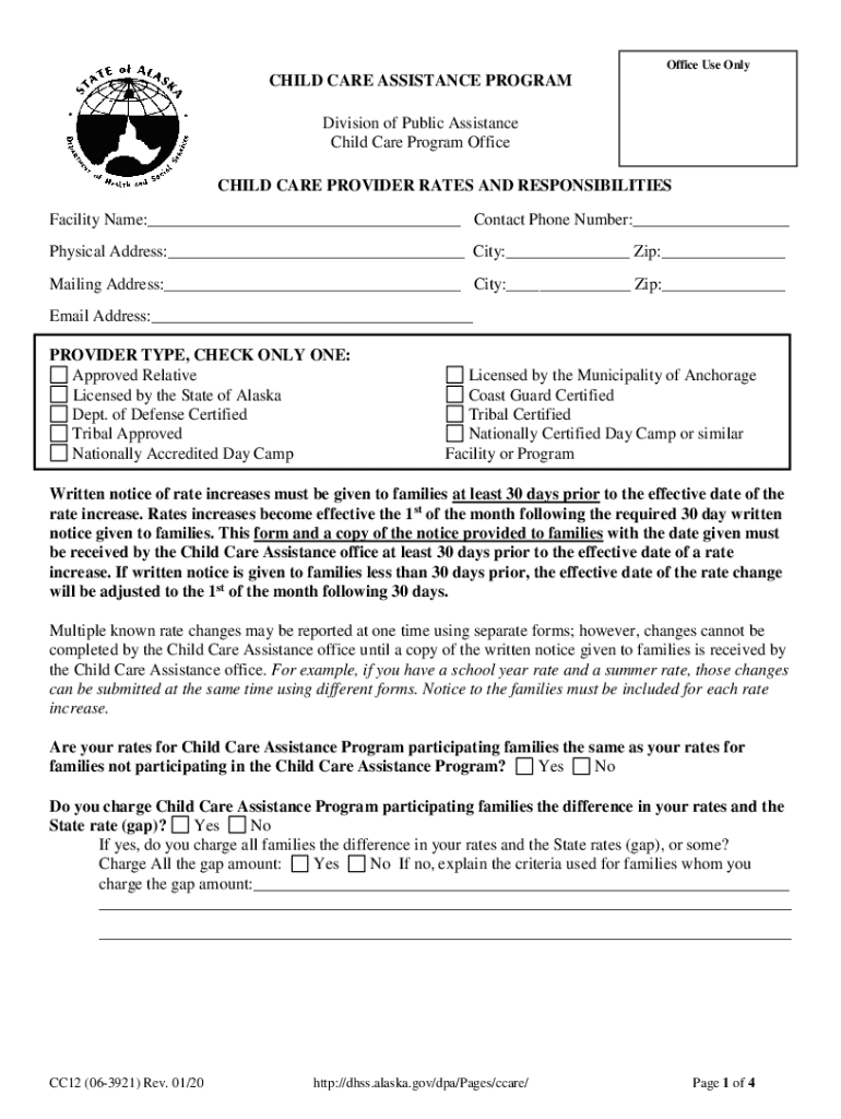 Office Use OnlyCHILD CARE ASSISTANCE PROGRAM Division of Public Assistance Child Care Program Office CHILD CARE PROVIDER RATES AND RESPONSIBILITIES Facility Name:___ Contact Phone Number:___ Physical