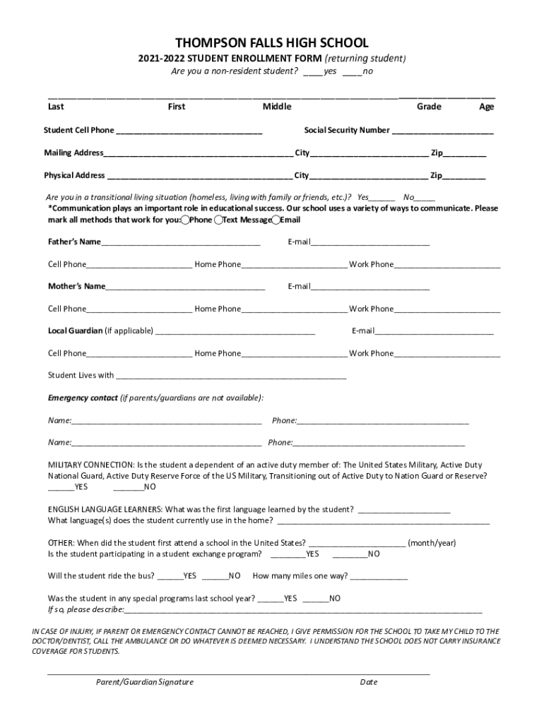 THOMPSON FALLS HIGH SCHOOL 20212022 STUDENT ENROLLMENT FORM (returning student) Are you a nonresident student? ___yes ___no ___ Last First Middle Grade Age Student Cell Phone ___Social Security Number