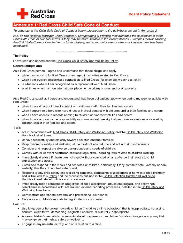 Board Policy StatementAnnexure 1: Red Cross Child Safe Code of Conduct To understand the Child Safe Code of Conduct below, please refer to the definitions set out in Appendix 2. NOTE: The National