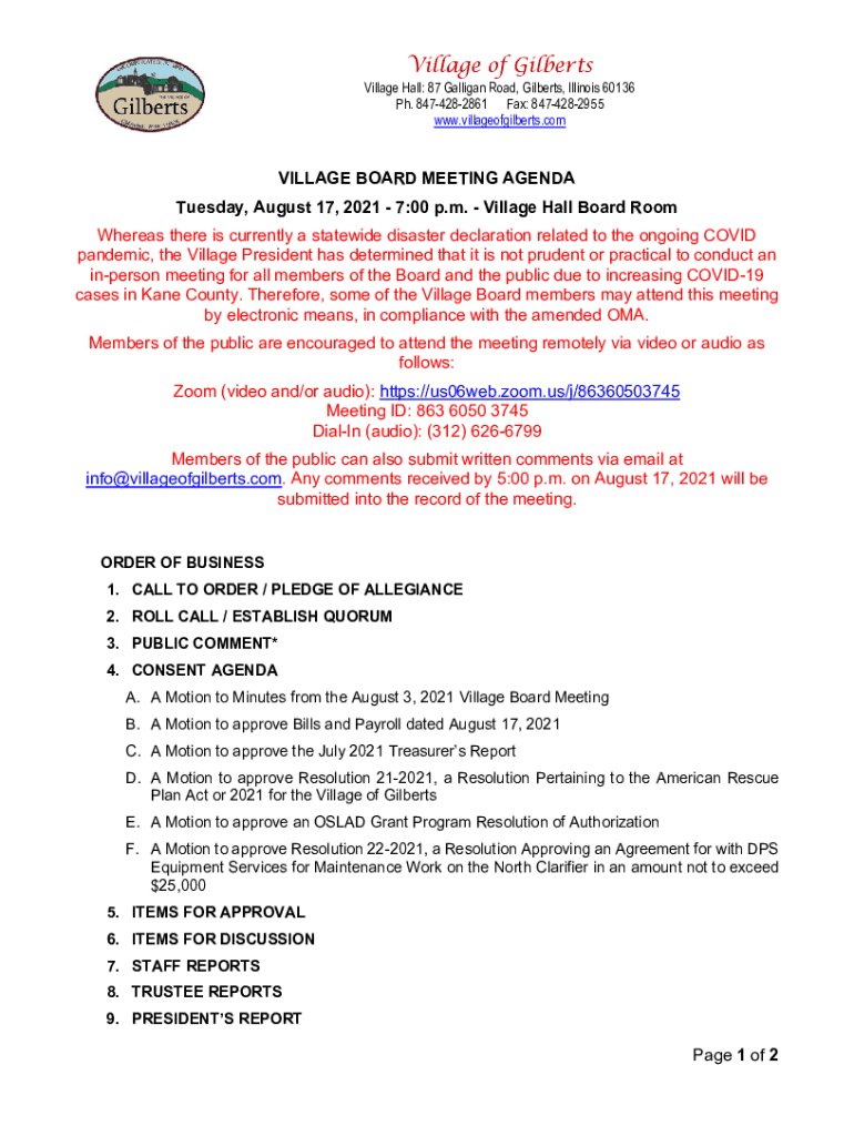 Village of GilbertsVillage Hall: 87 Gilligan Road, Gilbert's, Illinois 60136 pH. 8474282861 Fax: 8474282955 www.villageofgilberts.comVILLAGE BOARD MEETING AGENDA Tuesday, August 17, 2021 7:00 p.m.